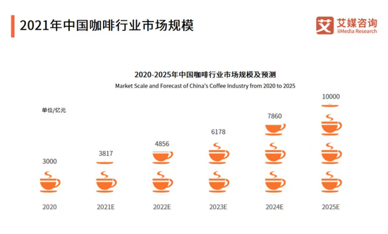 另一方面,艾媒咨询数据显示,2021年中国咖啡市场规模约3817亿元,咖啡逐渐在中国消费者生活中普及,市场进入一个高速发展的阶段,预计行业保持27.2%的增长率上升,2025年咖啡市场规模将达10000亿元。