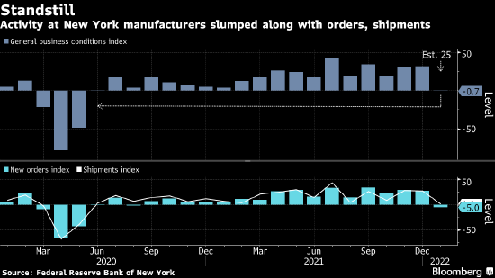 周一公布的数据显示,纽约联储银行制造业指数从一个月前的31.9锐降至-0.7。低于零表明经济活动萎缩,且该数据逊于接受彭博的所有经济学家预期。