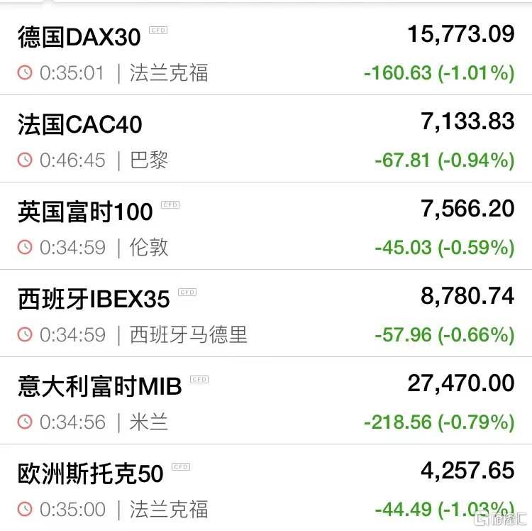 格隆汇1月19日丨德国DAX30指数跌1.01%,法国CAC40指数跌0.94%,英国富时100指数跌0.59%,西班牙IBEX35指数跌0.66%,意大利富时MIB指数跌0.79%,欧洲斯托克50指数跌1.03%。
