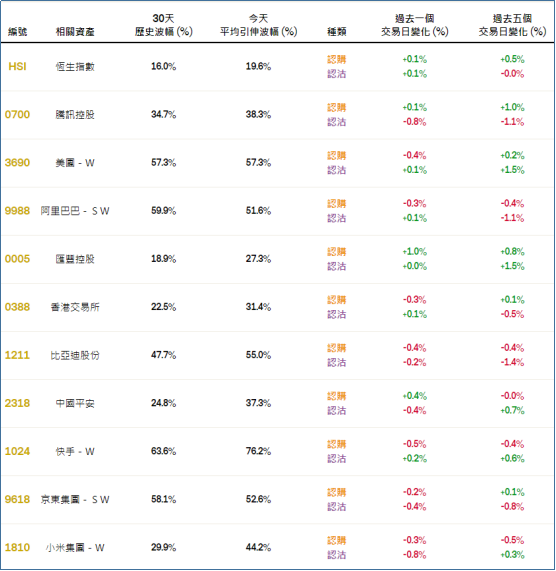 周二恒指相关权证的平均引伸波幅报约19.6%,按日提升0.2个百分点。个股方面,汇丰相关认购证的引伸波幅上升1%。