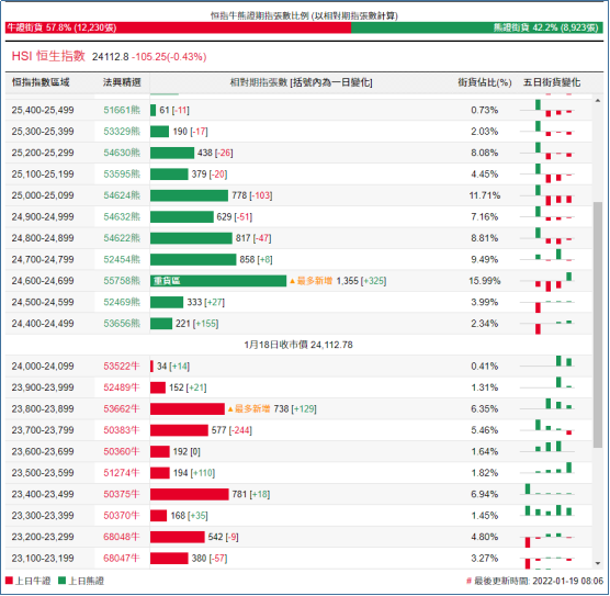 街货分布方面,至周二,恒指牛证街货在收回价23500点至24000点之间,累计相当约1853张期指合约;恒指熊证街货在收回价24600点至25100点之间,累计相当约4437张期指合约。