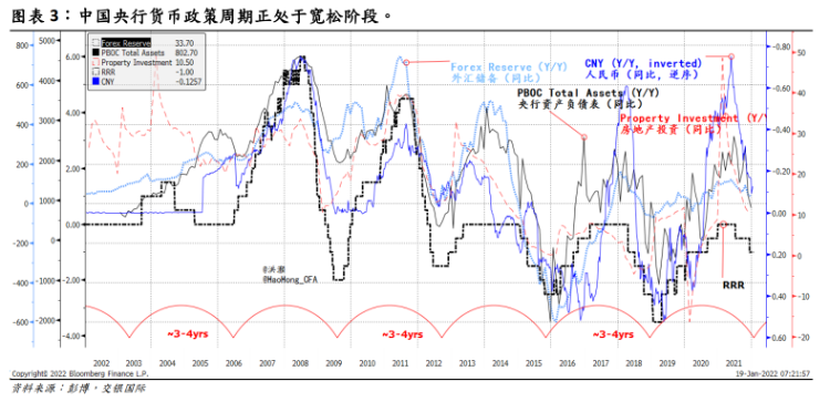 在这一阶段,央行将下调存准和利率,投资增速将随之而减,外储将见顶而人民币将走软。我们在题为《展望 2022:夕惕若厉》的展望报告中已细致入微地探讨了我们的经济周期理论对投资的启示。
