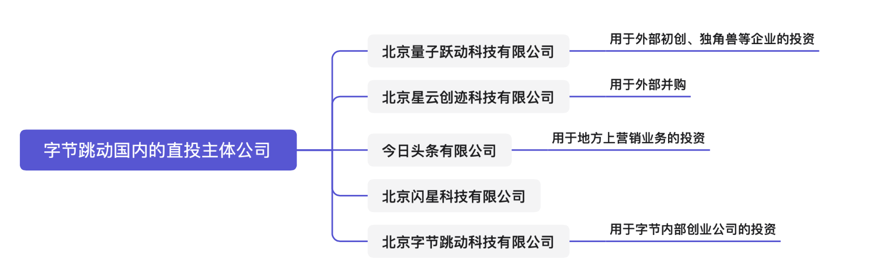 字节对外投资的主体也变成了5个,分别为北京量子跃动科技有限公司、北京星云创迹科技有限公司、今日头条有限公司、北京闪星科技有限公司、北京字节跳动科技有限公司,这5家公司分工明确,分别管理不同的投资项目。
