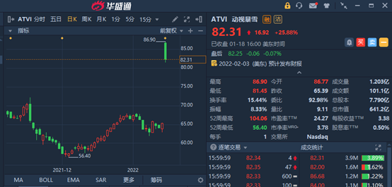 受此利好消息提振,动视暴雪昨日暴涨近26%报82.31美元,总市值641亿美元。