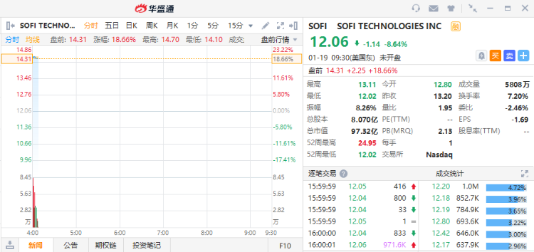 SOFI涨近19%,股价报14.31美元。消息面上,SOFI获得监管部门批准成为一家全国性银行(SoFi Receives Regulatory Approval To Become A National Bank)。