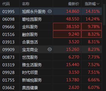 内地物业管理股涨幅扩大 旭辉永升服务、碧桂园服务涨超14%