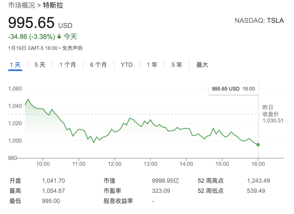 周三,特斯拉股价下跌3.38%,报995.65美元。在加息预期升温的背景下,伴随着科技股下滑,该股年初迄今已下滑17%。