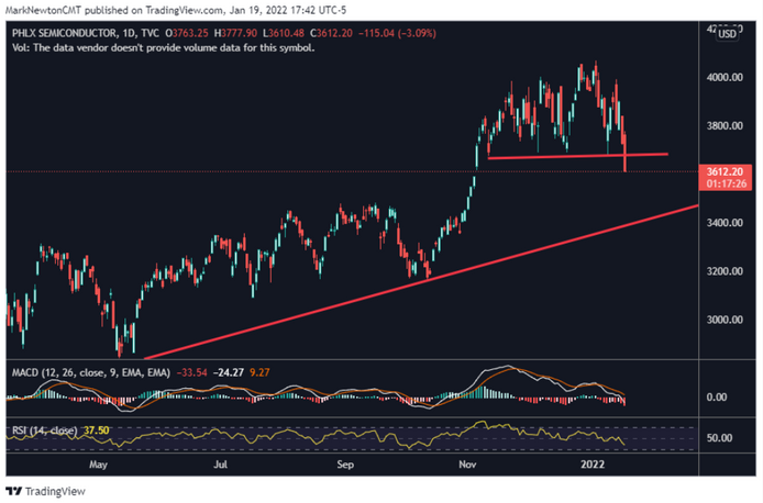 市场技术分析员马克·牛顿(Mark Newton)指出,半导体ETF这个很具代表性的科技投资标的,“刚刚跌破了自去年11月以来的低点。”