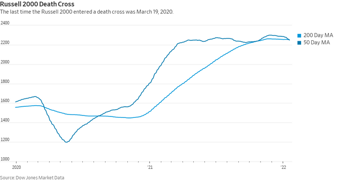 罗素2000指数的50日均线已低于200日均线。据悉,当50日均线走到200日均线下方时,就会出现所谓的“死亡交叉”,许多技术分析人士称,这意味着短期回调演变成了长期下行趋势。