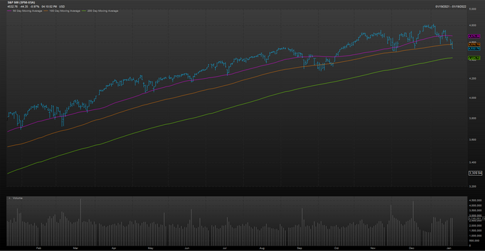 标普500指数周三跌破了100日均线。这个综合反应大盘的指数自去年10月以来从未收于这一水平之下。好在,其尚未跌破200日均线。