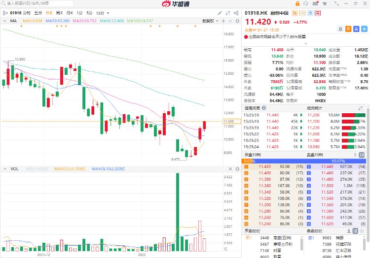 华盛资讯1月21日消息,融创中国午后续涨4.77%,现报11.42港元每股,成交额16.12亿港元,周内涨幅超24%,最新市值622亿港元。