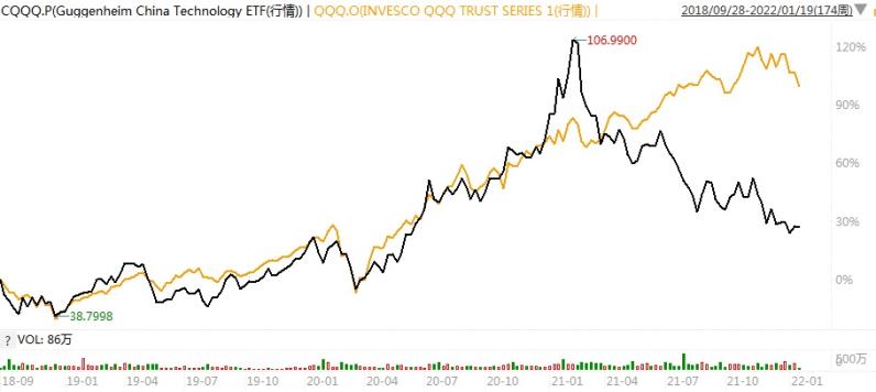 跟踪美股科技股的基金QQQ和跟踪中概科技股的基金CQQQ一直走势非常同步,但是从21年初开始,二者之间的差距越拉越大,现在QQQ有向下趋势,CQQQ有向上趋势,二者最终会再次同步走势吗?