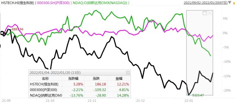去年最后一天,12月30日纳斯达克金龙中国指数(HXC)收涨9.4%,创2008年以来最大单日涨幅,2022新年以来,港股以及中概股表现明显强于A股也强于美股,年初至今,恒生科技指数涨幅3.28%,沪深300指数跌2.21%,纳斯达克指数跌13.76%。