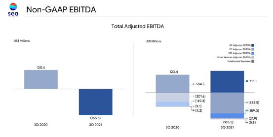 电子商务部门目前还没有盈利。事实上,我们可以在下面看到,在最近一个季度,SE的数字娱乐部门在调整后的息税折旧摊销前利润(EBITDA)中实现了7.15亿美元,但仅在电子商务领域就消耗了6.84亿美元。