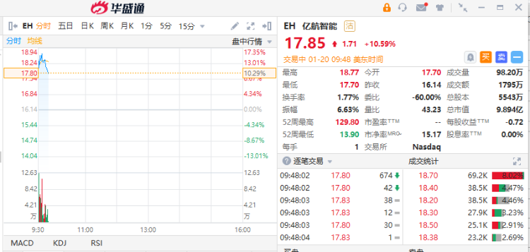 华盛资讯1月20日消息,美股盘初,热门中概股普涨,截至发稿,亿航智能(EH)涨超10%,现报17.85美元,此前公司获得日本50架EH216预售订单。