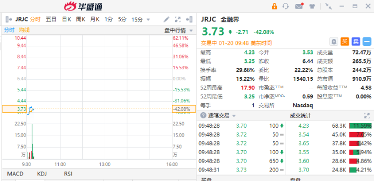 金融界(JRJC)跌超42%,现报3.73美元;盘初一度跌近50%,消息面上,该公司收到纳斯达克退市通知。