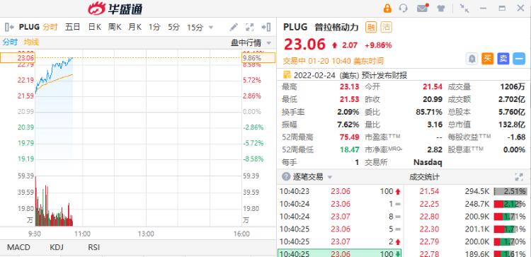华盛资讯1月20日消息,美股盘中,清洁能源股集体上涨,普拉格能源(PLUG)涨超9%,现报23.06美元。