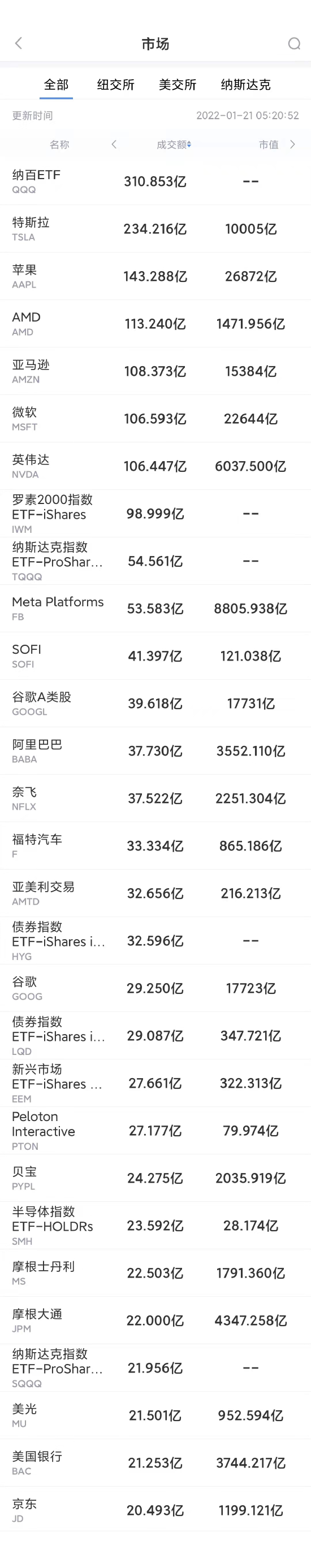 以下为美股当日交易最活跃的20只股票(按成交额):