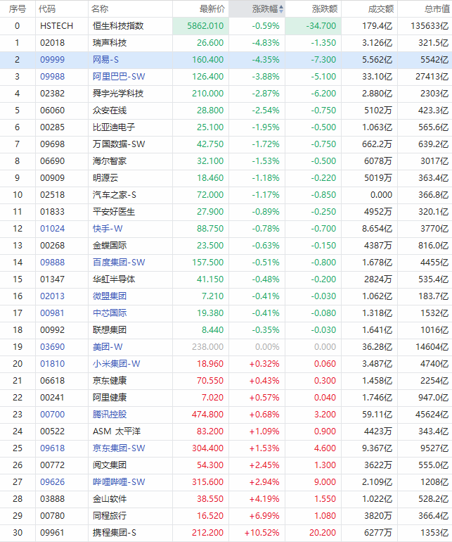 瑞声科技续跌4.83%,现报26.6港元每股;网易跌4.35%,阿里跌超3%,快手跌0.78%;芯片股华虹半导体、中芯国际微跌。