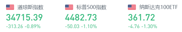 周四收盘,美国三大股指再跳水收跌。其中道琼斯指数下跌0.89%,报34715.39;标普500指数下跌1.10%,报4482.73;纳斯达克指数下跌1.3%,报14154.02。