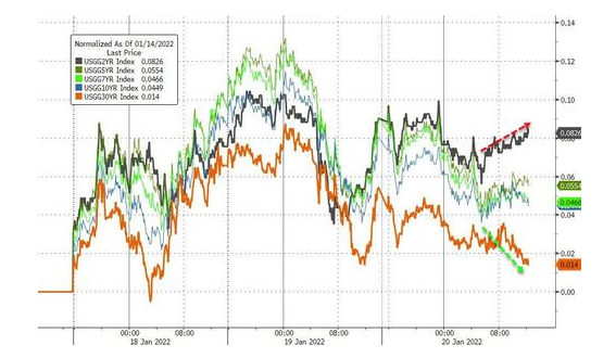 各周期美债收益率周四(1月20日)全线走低,其中长债收益率的回落幅度尤为明显。当天公布的美国初请失业金数据表现不佳,表明奥密克戎变异毒株感染病例激增正在打击美国就业市场。而在债市新年头两周遭遇大幅抛售,推动收益率触及两年高位后,一些美债买家如今也正被重新吸引入场。