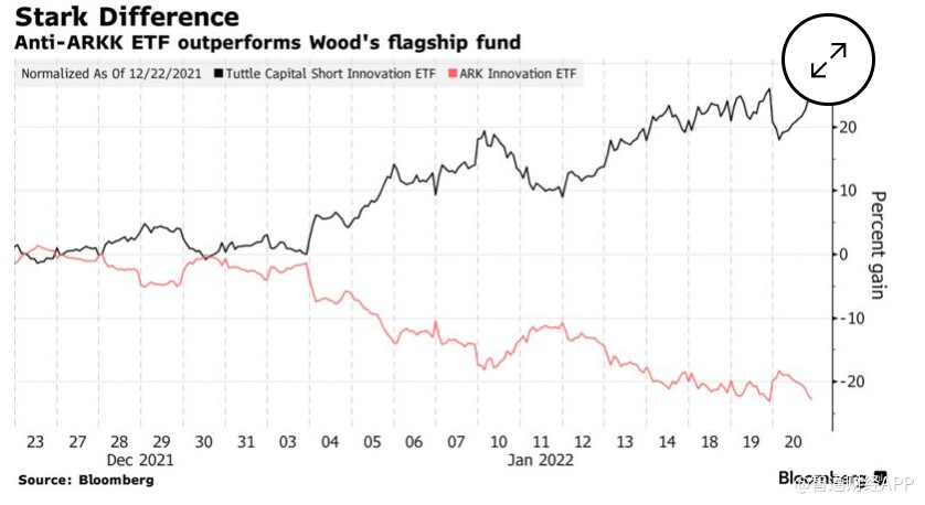 周五,一只与“木头姐”凯西·伍德旗下旗舰基金ARKK“对着干”的ETF现在已经积累了2.34亿美元的资产。这只成立不到三个月的基金Tuttle Capital Short Innovation ETF(SARK.US)目前回报率约为50%。