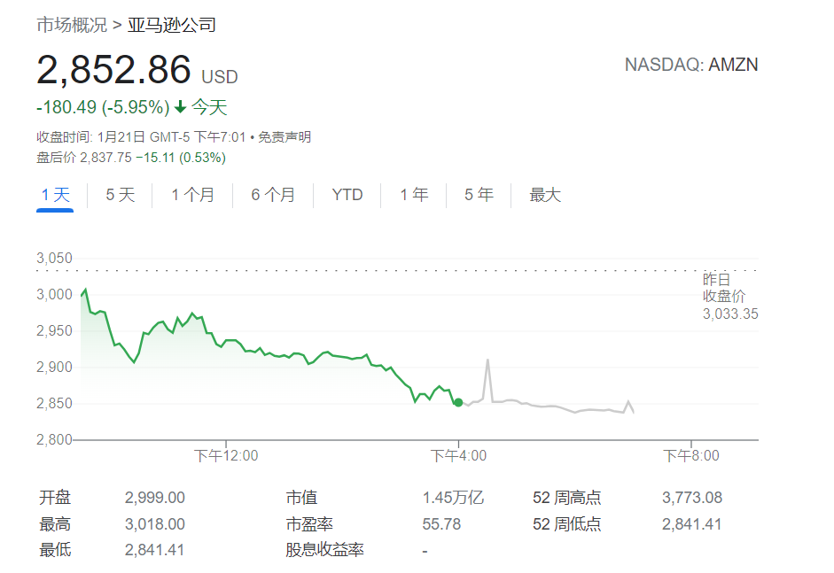 在本轮跌势中,除了因财报“暴雷”而暴跌的奈飞(Netflix),亚马逊(Amazon)的表现也值得关注。亚马逊股价周五收跌5.95%,报2,852.86美元,本周跌幅达12%。这标志着亚马逊自2018年12月21日当周下跌13.4%以来最差的单周表现。
