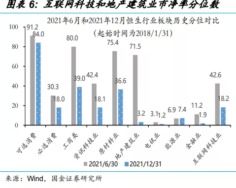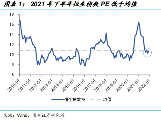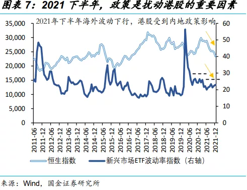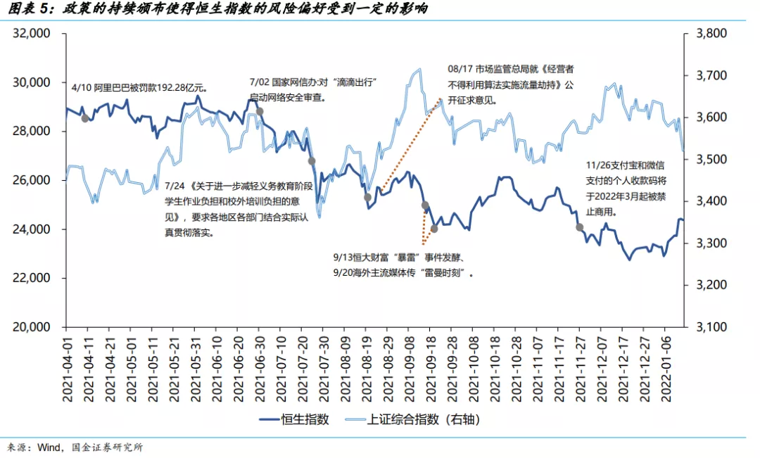 2021年6月以来,恒生指数的下行,主要与内地经济基本面走弱,及行业整顿政策带来的预期波动等有关。在经济新旧动能转型下,经济周期弱化、结构分化加剧,一方面导致有效需求不足。另一方面,在“双碳”政策下,供给端收缩带动原材料价格上涨挤压下游利润,企业经营压力较大。同期,决策层面出现了较为严格的监管措施,包括2021年7月以来,互联网反垄断和“双减”政策的接连落地,使得资本流动较为自由的香港市场比内地市场面临更大的抛售压力,恒生资讯科技、恒生地产建筑和恒生互联网科技业估值受到重挫。