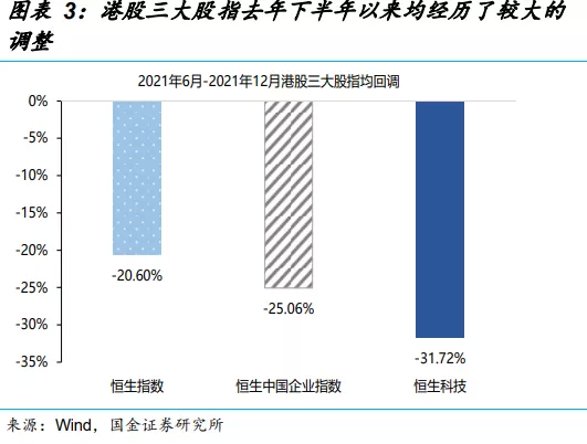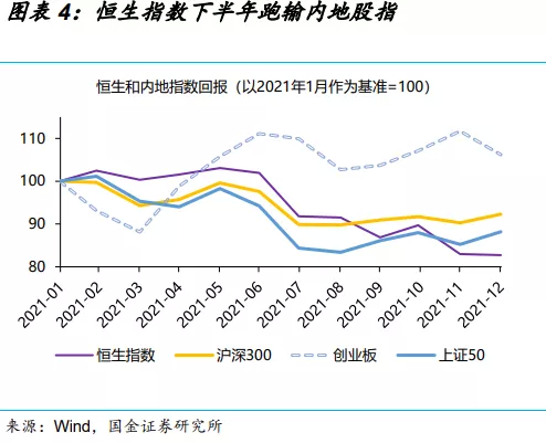 然而,与主流预期截然相反;2021年下半年以来,恒生指数一路下行,表现明显不及内地股指。从2021年6月开始到年底,在市场一片看多的情绪中,港股三大股指进一步回落,恒生、恒生中国和恒生科技指数分别回落20.6%、25%和31.7%的跌幅。相同时间,沪深300和上证50分别回调7.51%和10.31%,而创业板则上升0.68%,三大股指表现均好于香港股指。