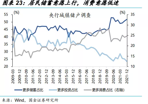 往后看,一方面,预防式储蓄意愿的提升抑制了消费倾向,央行城镇储户调查显示居民储蓄意愿上行但消费意愿低迷。