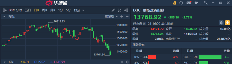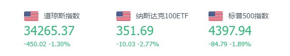 上周纳指累计下跌7.55%,道指下跌4.58%,标普500指数下跌5.68%。上周五道指跌450.02点,跌幅为1.30%,报34265.37点;纳指跌385.10点,跌幅为2.72%,报13768.92点;标普500指数跌84.79点,跌幅为1.89%,报4397.94点。