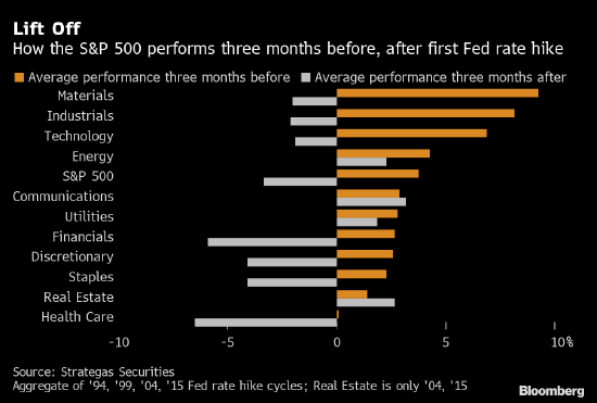 根据Strategas Securities,从历史上看,投资者在首次加息前维持周期性偏向是有利的,但随后三个月的表现比较麻烦。在过去30年里,美联储有四个不同的加息周期。例如,标普500原材料指数在这四个周期首次加息前三个月平均上涨9.3%,但开始加息后三个月又下跌2%。