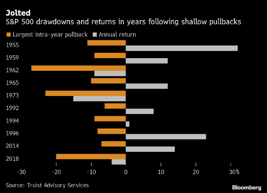 Truist认为,历史表明今年不会是2021年那种5%或更小幅度的温和回撤,而是有可能达到两位数。自1955年以来,在回调幅度最浅的10个年份之后,美国股市在次年往往会上涨,但波动更大。Truist的数据显示,标普500指数次年的最深回调幅度平均是13%,而总回报平均为7%。