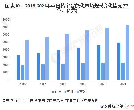 根据2021年12月由美控智慧建筑联合亿欧智库共同发布的《中国楼宇自控白皮书》,2021年中国楼宇智能化市场产值约达为7238.2亿元,结合近几年行业的发展趋势,经过初步估算,2016-2021年中国楼宇智能化市场规模逐年上升,存量规模接近5000亿元而新增规模超过2200亿元。因楼宇智能化在低碳、节能方面优势突出,同时能为人们生活带来更多舒适体验,加之政府对楼宇智能化建设规范化、科学化的引导,未来楼宇智能化发展前景较好。