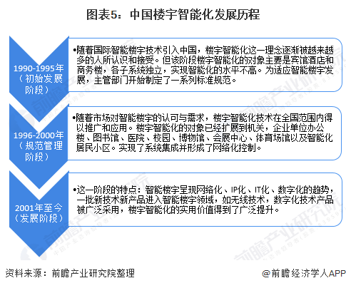 2001年至今,是行业的发展阶段。该阶段的行业特征为突飞猛进发展且应用场景更为广阔。随着高新技术的发展,物联网、5G、云计算和人工智能成为目前技术发展的热门议题。因此,行业未来的发展趋势呈现数字化和IP化的特征,且与战略性新兴技术融合发展将为行业升级提供不可或缺的动力支撑。综合来看,我国楼宇智能化从最开始的理念成型到市场需求认可,再发展至如今的高新技术融合阶段;而我国楼宇智能化的应用市场从宾馆酒店和写字楼,到如今的广泛应用于医院、校园和博物馆等场景。综合来看,中国楼宇智能化发展十分迅猛。