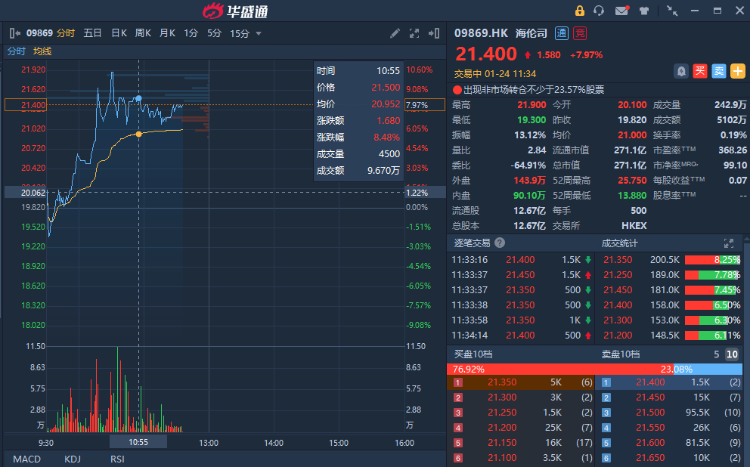 华盛资讯1月24日讯,港股餐饮股拉升,海伦司涨近8%,九毛九涨3.4%,高门集团涨3.33%,呷哺呷哺涨超3%。