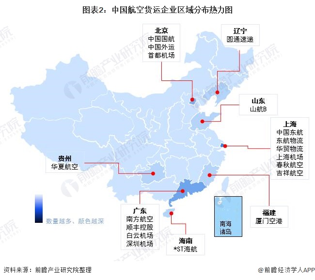 从上市企业区域分布来看,我国航空货运企业多分布在东南沿海的交通便利地区,上海、广东凭借良好的经济优势,上市企业数量最多;北京市作为我国首都以及重要交通枢纽,也拥有较多的上市企业;中西部地区航空货运行业发展则明显落后,鲜有上市企业分布。