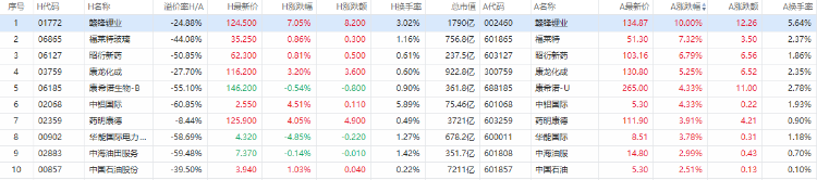 以A股收盘时间,AH股涨幅前10如下: