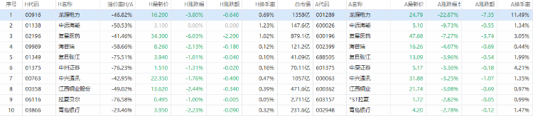 AH股跌幅前10如下: