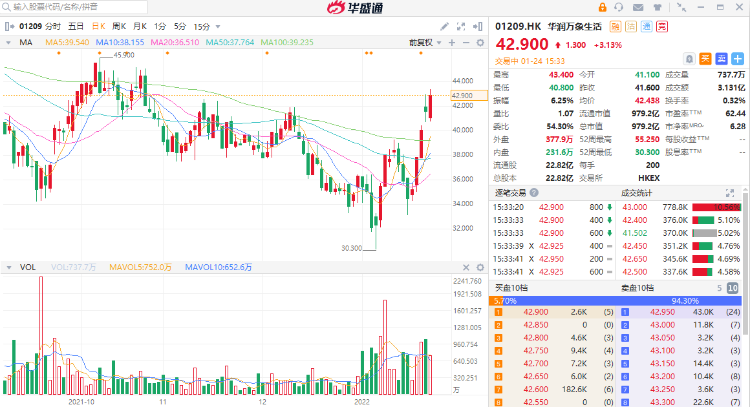 华盛资讯1月24日消息,华润万象生活稳健上涨,截至发稿,涨3.13%,现报42.9港元每股,成交额3.13亿港元,近5个交易日累涨近25%。