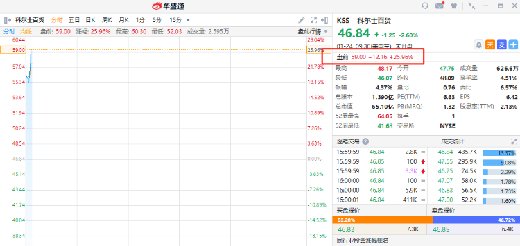 热门个股中,柯尔百货(KSS)盘前大涨近26%,报59美元。三名知情人士周日表示,因私募股权公司Sycamore Partners准备在激进投资公司Starboard Value支持的财团提出收购美国百货公司柯尔百货几天后提出收购要约,这意味着该公司可能很快收到第二份收购要约。
