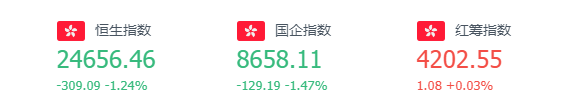 截至1月24日周一收盘,恒生指数跌1.24%,报24656.46点;国企指数跌1.47%,红筹指数跌涨0.03%。恒生科技指数跌2.84%,哔哩哔哩跌8.48%,网易跌7.46%,阿里巴巴跌6.29%。