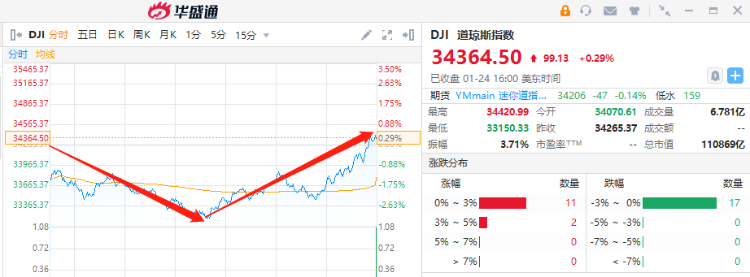 截至周一收盘,道指上涨99.13点,涨幅0.29%,报34364.50点;纳指收盘上涨86.21点,涨幅0.63%,报13855.13点;标普500指数收盘上涨12.19点,涨幅0.28%,报4410.13点。