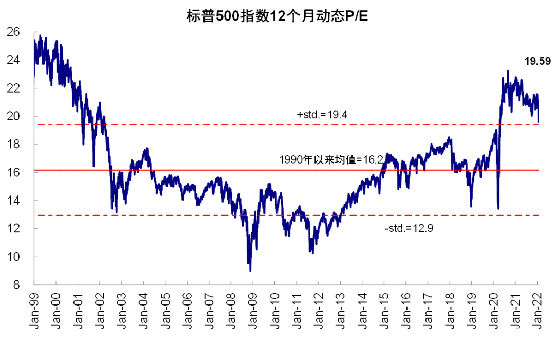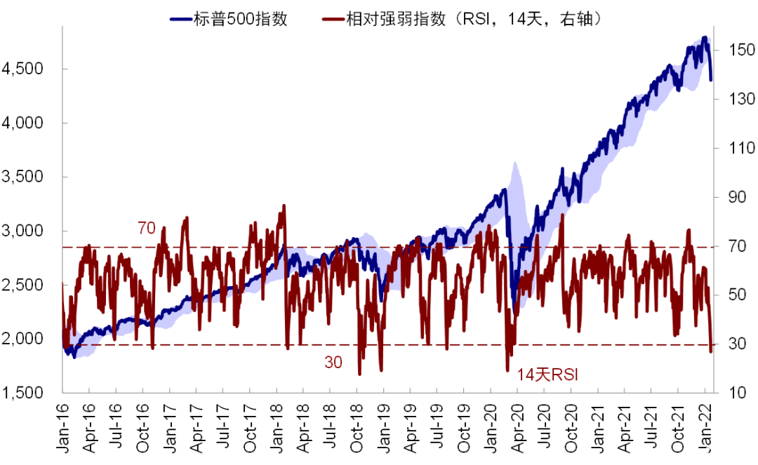 我们在昨天的报告《美股跌到位了么?计入了多少预期?》中分析了近期回调后美股估值和情绪等指标所处的位置,整体结论为:1)年初以来美股回调都是估值所致,盈利预期整体依然稳健。当前标普500 12月动态估值回落至19.6倍,接近长期历史均值上方一倍标准差(19.4倍),可比口径下已经低于疫情前。我们的模型测算基本处于合理水平,而一些技术指标如超卖已较极端,指数也处于关键支撑位上(如标普在4400附近、纳指为13300左右);信用利差并未大幅抬升,长端国债空头大幅减少等;2)根据模型测算,美股当前计入一年加息预期为3.3次,相比市场利率期货和主流机构的预期也算是基本充分;3)如果加息4次利率抬升100bp的话,我们测算对应估值收缩10%。2年期国债已经升至1.2%,此期间估值已回落8%,也有了一定的反应;4)美股在2015年底首次加息后的全球动荡、2018年2月因利率抬升的波动、2018年10月的大跌中最大回撤幅度分别为10.5%,10.2%和20%,隔夜美股盘中跌幅也已经达到10%左右。
