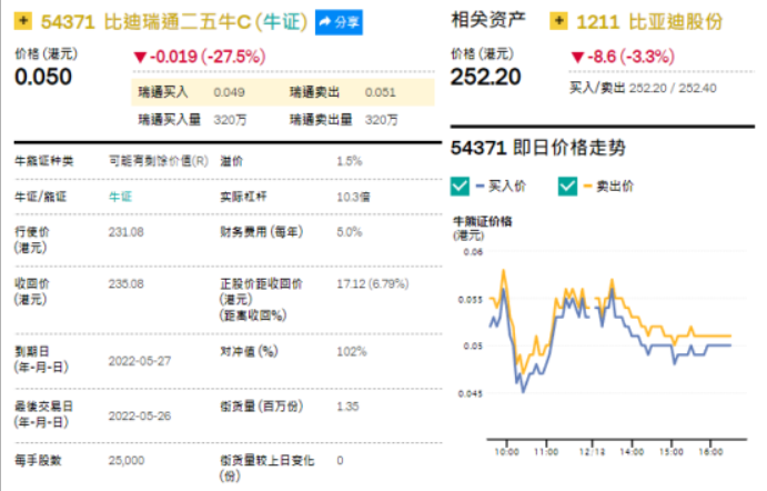 2、看错方向:比迪瑞通二五牛C(54371.HK),周一下跌27.5%。
