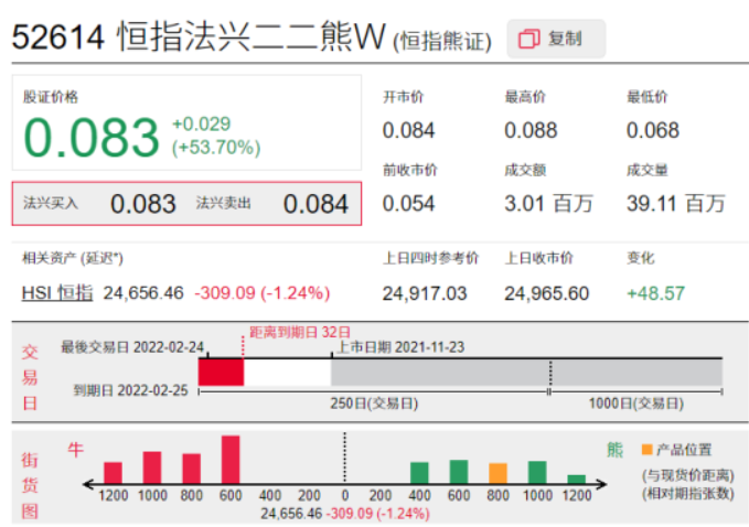 1、强势轮证:恒指法兴二二熊W(52614.HK),周一上涨53.7%;