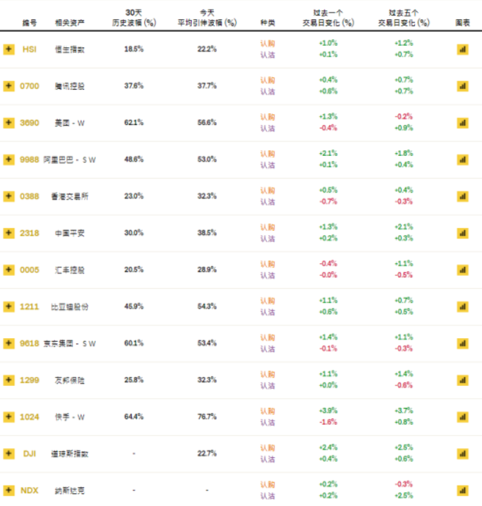 周一恒指相关权证的平均引伸波幅约22.2%,按日略有调升。个股方面,快手、京东集团等相关认购证及认沽证的引申波幅按日均有所调升;相反,港交所、美团等相关认购证及认沽证的引申波幅按日均显著调降。