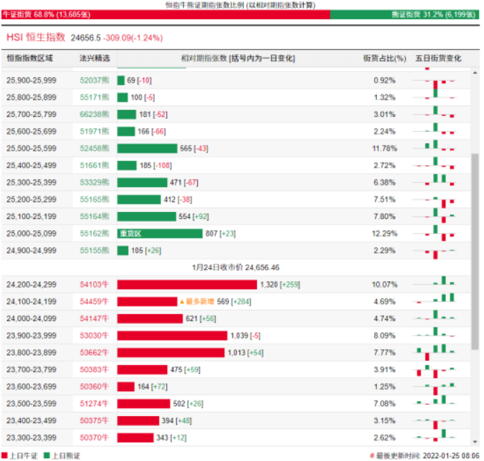 街货分布方面,至周一,恒指牛证街货重货区在收回价23800点至24300点之间,累计相当约4562张期指合约;恒指熊证街货重货区在收回价24900点至25400点之间,累计相当约2349张期指合约。