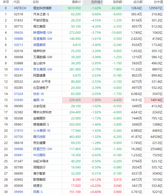 成分股普跌,汽车之家跌9.66%,报62.2港元每股;科网股B站、百度跌超3%;京东、快手跌逾2%;小米、腾讯、阿里跟跌;网易微涨0.6%。盘面上明源云、联想集团微涨。