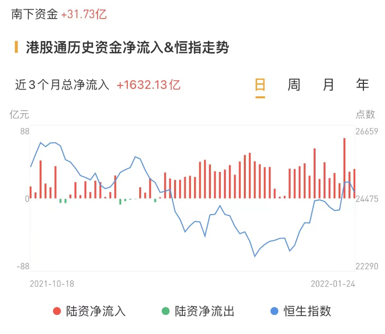 南下资金今日净流入港股31.73亿港元,上一交易日净流入35.75亿港元。